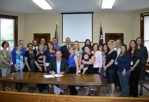| The Proclamation is signed by Judge Bird as professional child advocates look on. — at Gonzales County Courthouse. |